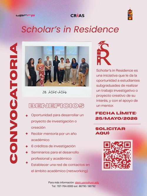 El Programa de Scholars in Residence (SR) es una iniciativa de CRiiAS, adscrito a la Facultad de Ciencias Naturales, que persigue promover un ambiente académico que facilite la investigación y la actividad creativa en el estudiantado subgraduado del Recinto de Río Piedras.